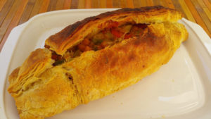 - Cuando esté listo, colocamos el relleno en el centro de una lámina de hojaldre y lo cerramos por los lados. Se puede dejar abierto por arriba o también cerrarlo